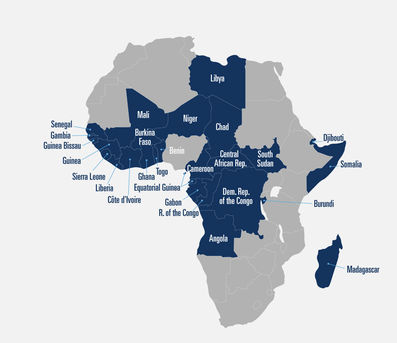 • África Occidental: Senegal, Ghana, Costa de Marfil, Nigeria, Benín, Togo, Guinea, Malí, Níger, Sierra Leona, Liberia, Guinea-Bissau.